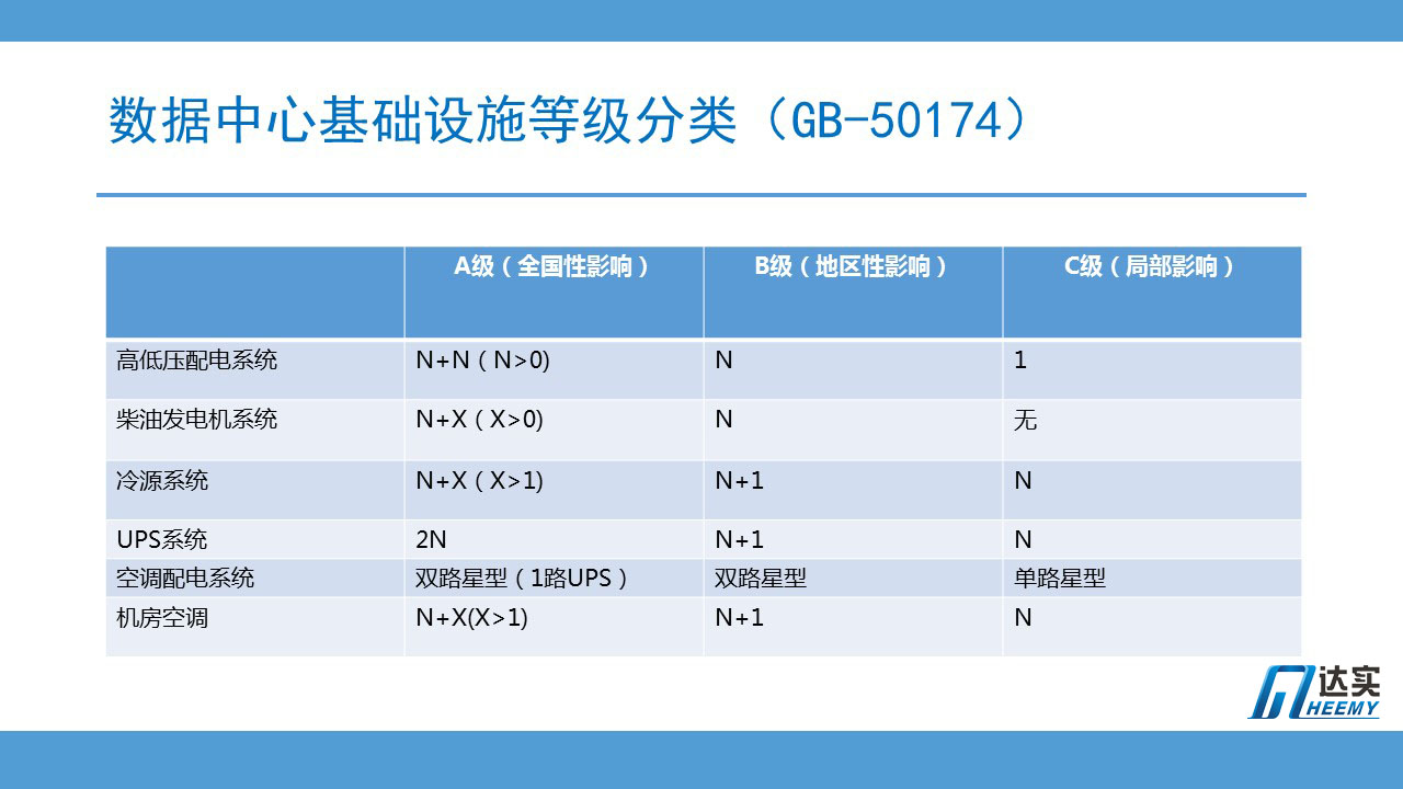 國標A級數(shù)據(jù)中心的建設(shè)標準,在系統(tǒng)和設(shè)備的配置上,基本和國際T4等級對應的,除了柴油發(fā)電機,所有系統(tǒng)和設(shè)備均為2N或N+2的冗余度要求。國標B級基本上和國際的T2等級對應。國標C級,基本是和國際T1等級對應。因此對于大部分數(shù)據(jù)中心遵循的Tier3等級標準,國標是沒有相對應的等級的。Tier3和國標A最大的差異在于對UPS系統(tǒng)的配置上,國標A級要求UPS系統(tǒng)采用2N雙總線的架構(gòu),而Tier3只要求滿足可在線維護不影響業(yè)務生產(chǎn),具體采用何種架構(gòu),可以有很多選擇方案。