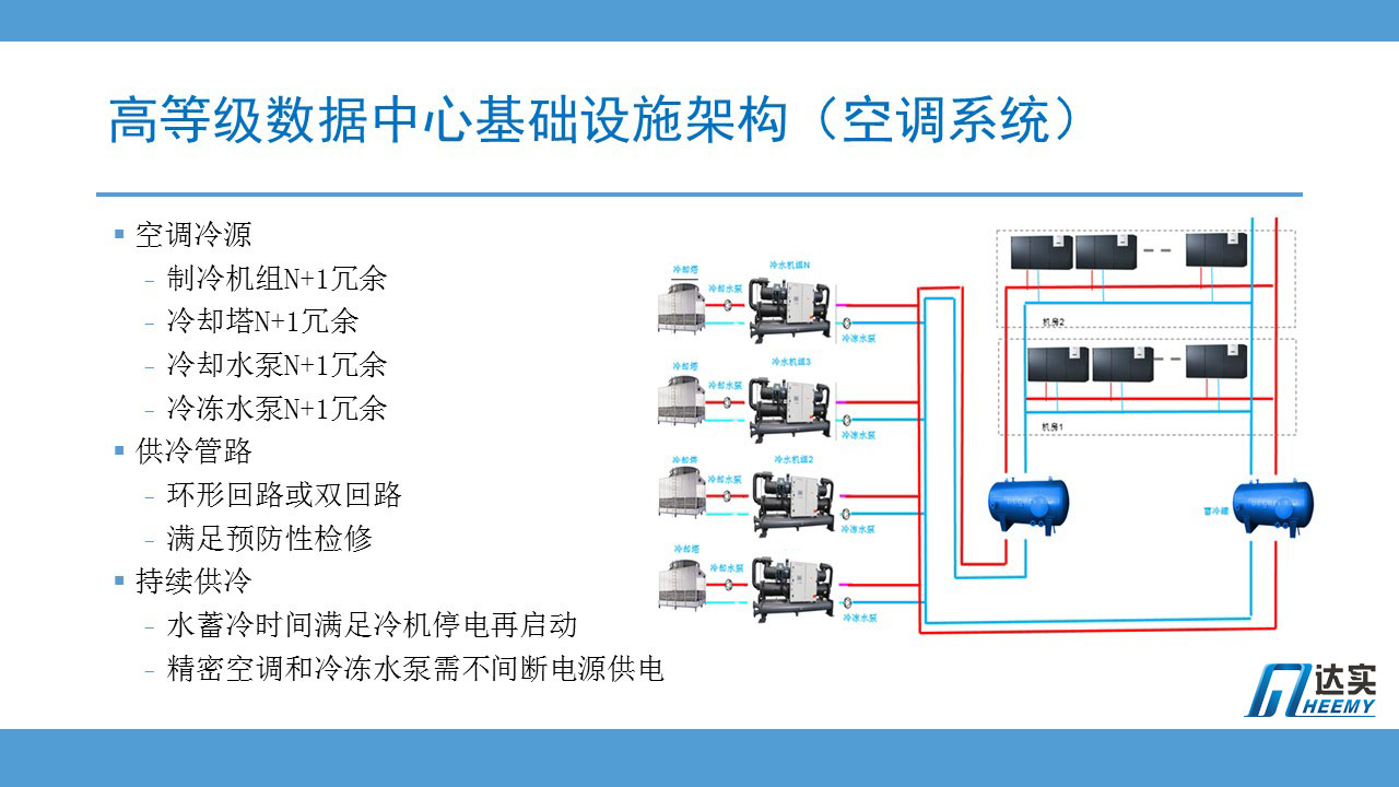 這是一個符合國標A級和國際T3等級數(shù)據(jù)中心空調(diào)架構(gòu)系統(tǒng)方案。冷凍機組如果采用N+1,只能滿足國標B級標準,但在早期低容量階段,可按N+2評估滿足國標A級。實際上國內(nèi)數(shù)據(jù)中心建設(shè)一般容量很大,實際負載很小,這一點上基本沒問題。