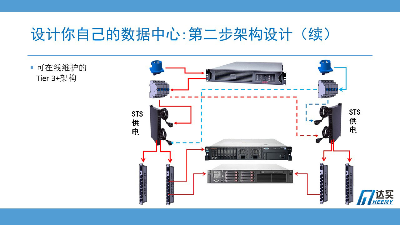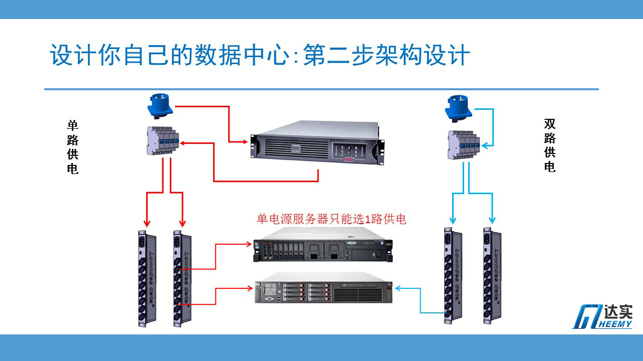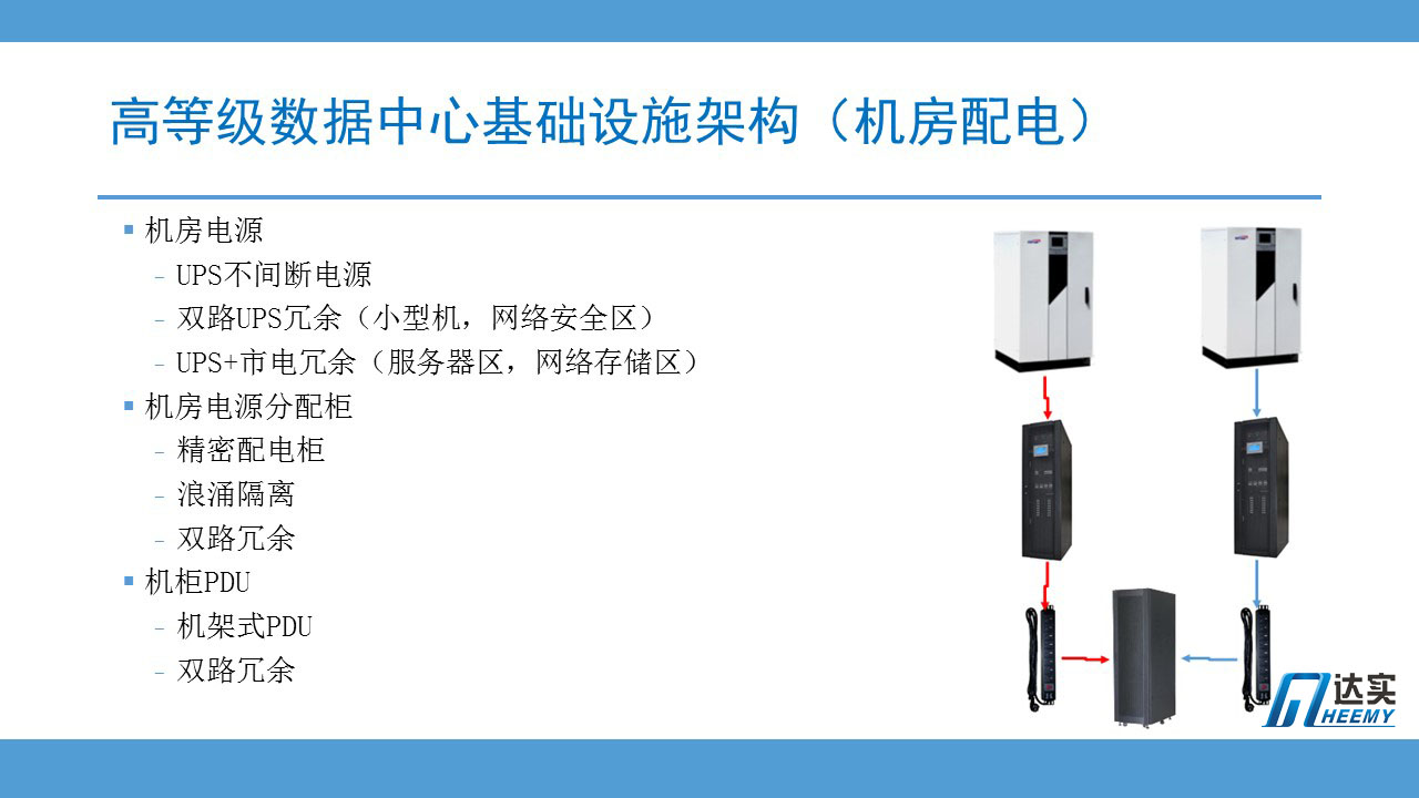 這是一個典型的國內(nèi)數(shù)據(jù)中心機房內(nèi)配電方案: 兩套UPS系統(tǒng),兩路獨立的配電柜和電纜系統(tǒng),一直到機柜內(nèi)兩個獨立的PDU。冗余度達到國際T4和國標A級標準。機房外不可控,機房內(nèi)加強,這是國內(nèi)數(shù)據(jù)中心主管部門(一般是IT部門)的主流做法。也是比較實用的做法。這一點,對于我們中小型數(shù)據(jù)中心的建設(shè)者,尤其值得參考。