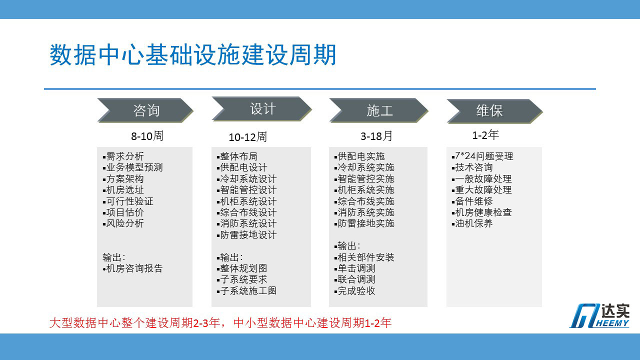 說到數(shù)據(jù)中心建設(shè),這是一個典型的路線圖,從規(guī)劃咨詢、設(shè)計施工、驗收交付,大型數(shù)據(jù)中心整個建設(shè)周期一般2-3年,中小型數(shù)據(jù)中心一般1-2年。有的數(shù)據(jù)中心光選址、審批、立項,就要花掉好幾年時間。