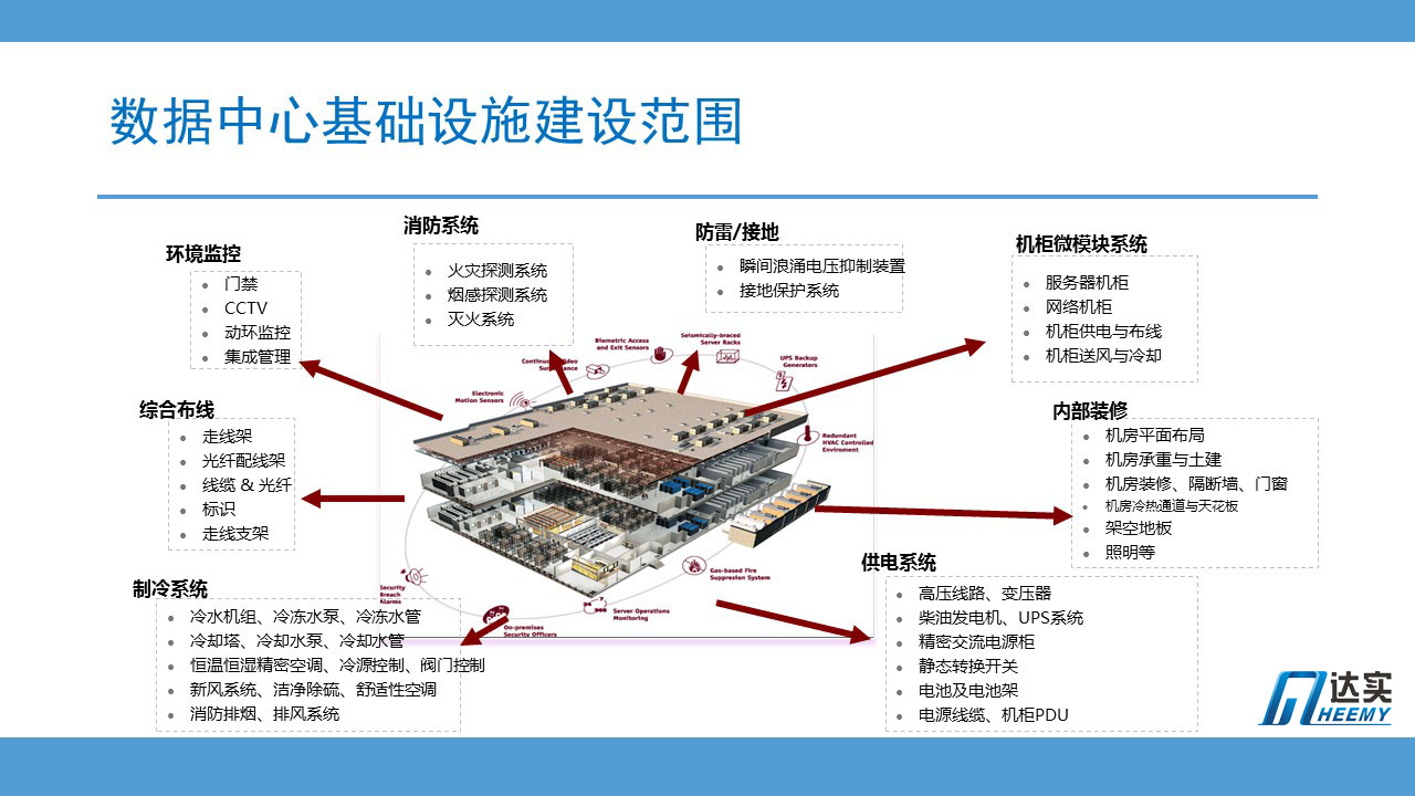 這個一個典型的數(shù)據(jù)中心建設(shè)項目需要考慮的內(nèi)容,除了之前說過的供電系統(tǒng)和制冷系統(tǒng),還有綜合布線,環(huán)境監(jiān)控,消防系統(tǒng)柜,防雷接地,機房裝修,機柜微模塊等。