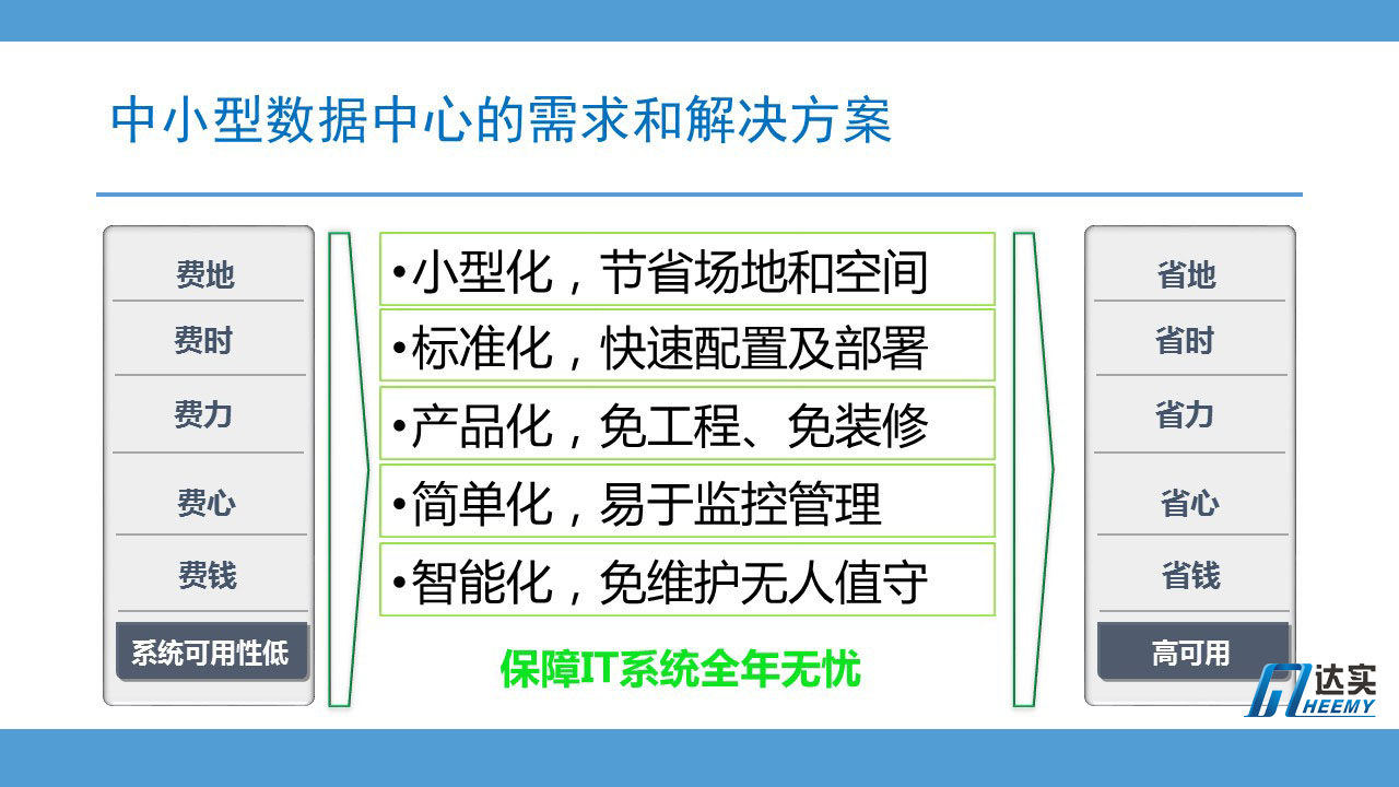 通過這樣一個簡單標準可靠的產(chǎn)品,保證IT系統(tǒng)全年運行高可用。用戶IT人員真正做到省地、省時、省力、省心、還省錢。