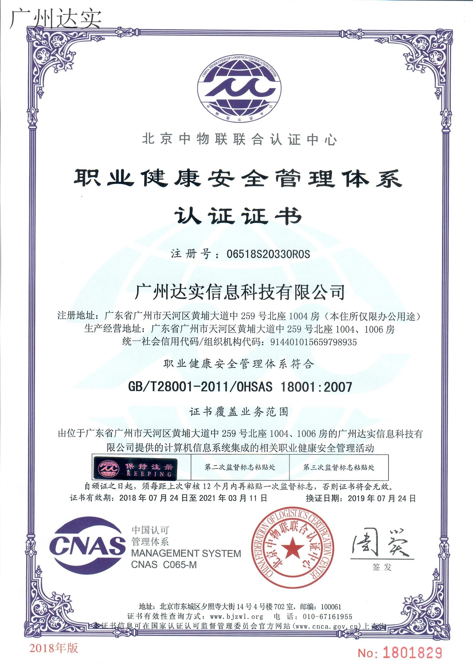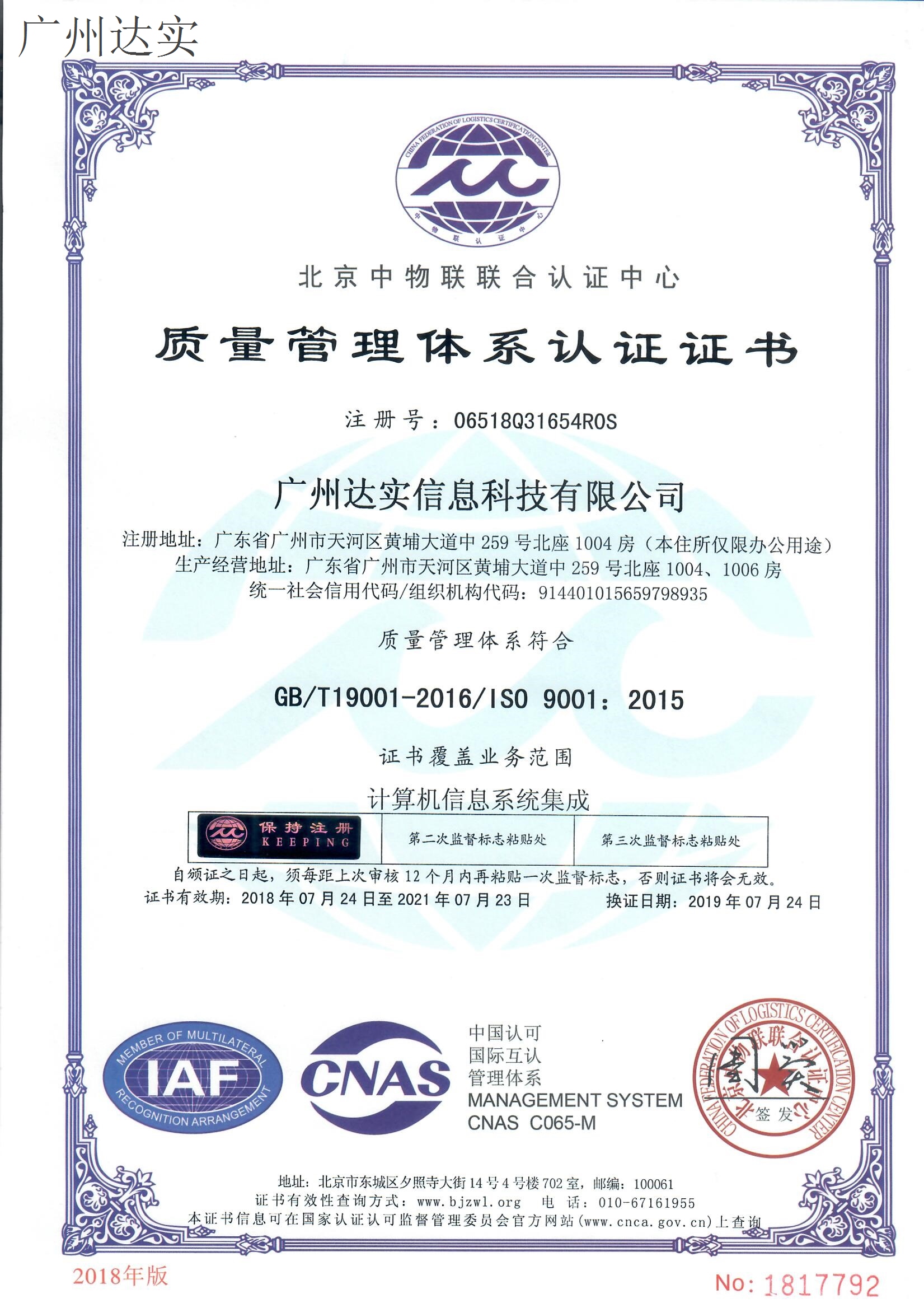 廣州達實信息科技有限公司-ISO管理體系認證證書