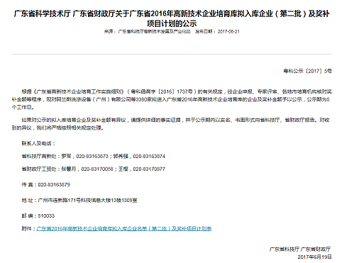 2017年06月21日,廣東省科學(xué)技術(shù)廳公告了《關(guān)于廣東省2016年高新技術(shù)企業(yè)培育庫擬入庫企業(yè)(第二批)及獎補項目計劃的公示》,廣州達實信息科技有限公司獲準...