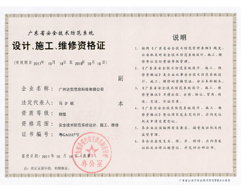 廣州達實信息科技有限公司安防資質(zhì)證書